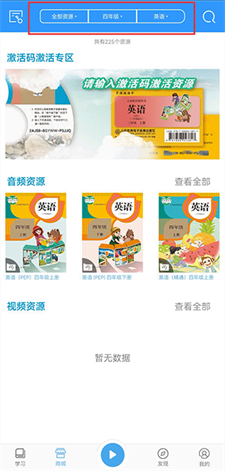 1、打开人教易视听app,首先在商城界面中根据年级、学科资源类型来筛选需要的教材