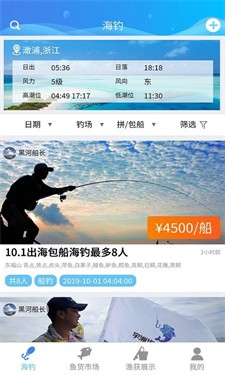 提供详细的天气预报信息,帮助用户轻松查询天气情况。可以与他人拼船海钓,节省成本。自有渔具商城,购买高性价比渔具,闪电发货。还有许多海钓活动,助您快速参与。
