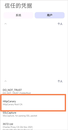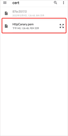 6、找到图中这个目录并根据需求选择证书进行安装,这里我选的还是.pem,文件路径:本机存储/httpcanary/cert/