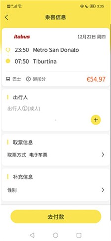 4、最后,在这里看清楚乘客信息,添加好出行人、取票方式、补充信息后就可以点击去付款了。