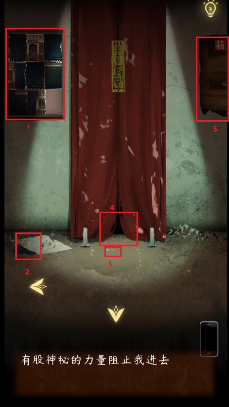 再次回到右边,我们可以利用玻璃碎片,将海报上的红布片割下来,然后在盆中放入金元宝,丢入红布片,金元宝便会开始燃烧,上方的海报也就随之移开。