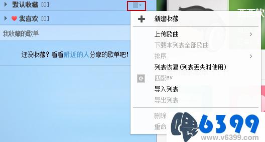 3、我的收藏界面中有两个默认的列表,任意选择一个列表或者新建一个列表点击列表后面,会出现一个下拉列表点击上传歌曲。