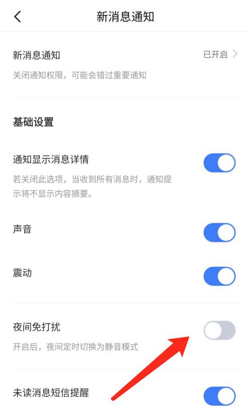 步骤五:在新页面中我们找到夜间免打扰功能,在它的后面有一个开关,将这里点击关闭就可以了。