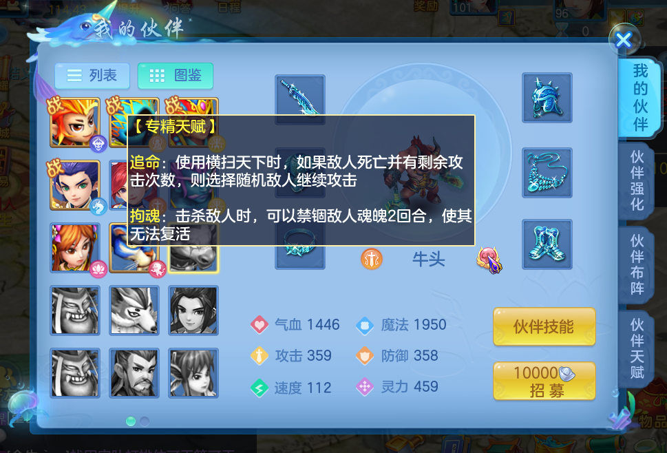 在竞技场中,大家为了尽可能高的拿到难度分,一般都会选择较为强势的阵容,曜华作为一个封系,自身输出能力一般的情况下更是如何。因此,我们一般选取一个天策伙伴主要针对敌方的宠物,一个万兽伙伴打出高额面伤,选择一个龙宫来重点针对敌方辅助职业,最后在选取一个佛门来提升续航能力。牛头因为携带有”追命”这个专精天赋,可以保证核心技能”横扫天下”的输出拉满,非常暴力,而马面作为万兽携带有”拘魂”的天赋可以让敌方在两个回合内减员,最后在选取一个摩昂太子,可以提供龙威的辅助。