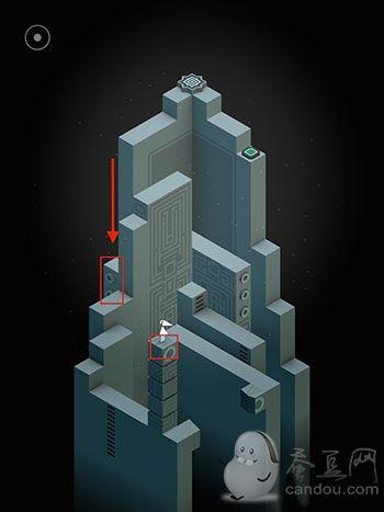 将图腾滑动到图示位置,然后到达艾达后面,控制艾达走上图腾,向上滑动左侧按钮,将图腾向前移动。再向下滑动按钮,图腾再往前移动一步。到达拱门,进入新场景。