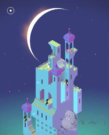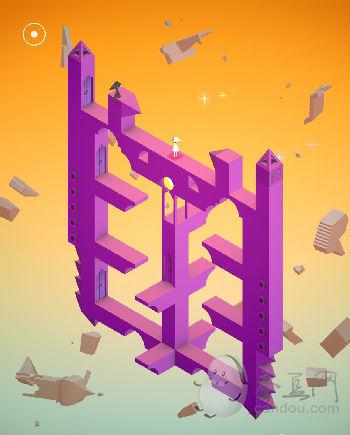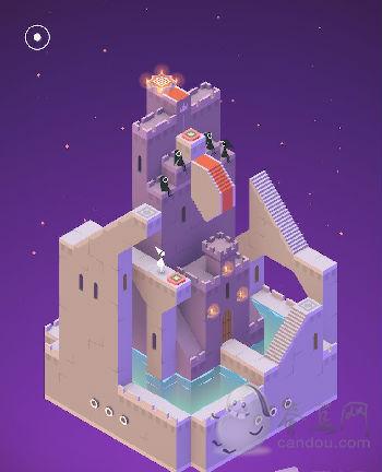 在出现的黑色场景中与蓝色精灵互动(几何神功,难道和如来神掌一样?吐槽不能)。直接走入洞口,出现在紫色城堡处。这里常需要各种旋转。首先让艾达走到制高点。