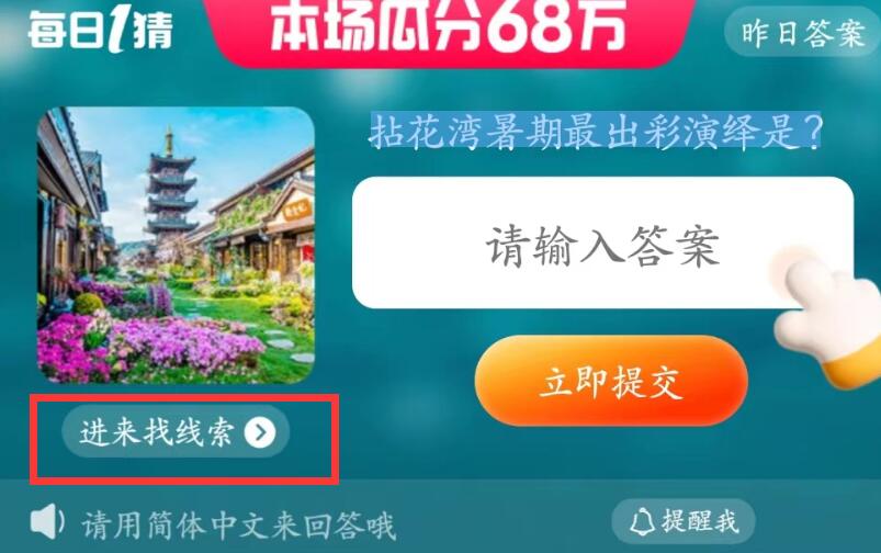 拈花湾暑期最出彩演绎是?淘宝大赢家每日一猜6月30日的最新问题当中玩家需要找到拈花湾暑期最出彩演绎是的答案,答对就能够获得奖励,那么每日一猜6月30日的答案是什么呢?今天小编为玩家们带来的是6月30日的问题及答案,还不了解的小伙伴可以来到这里看一看。