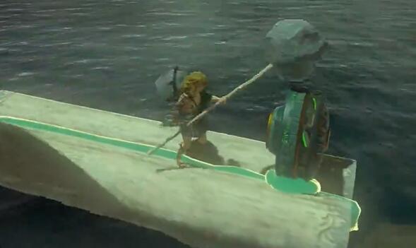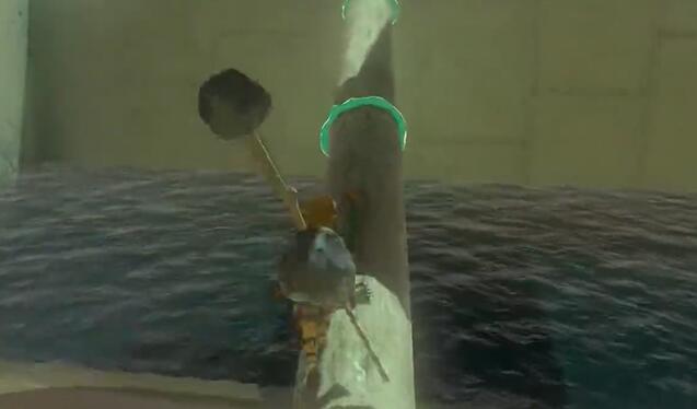 1、使用究极手将旁边的石柱抓起来并且斜着摆放即可上去。