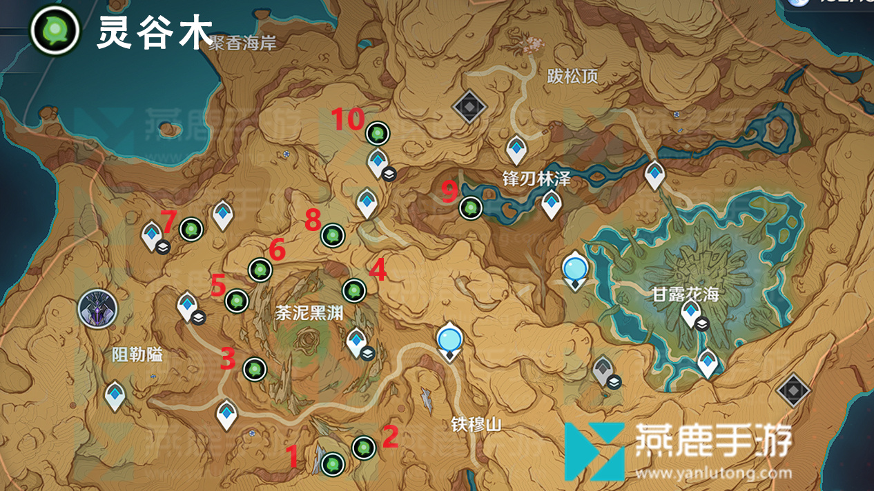 Tips:其中灵古木5,7,8,10位于地下,前往方式如下