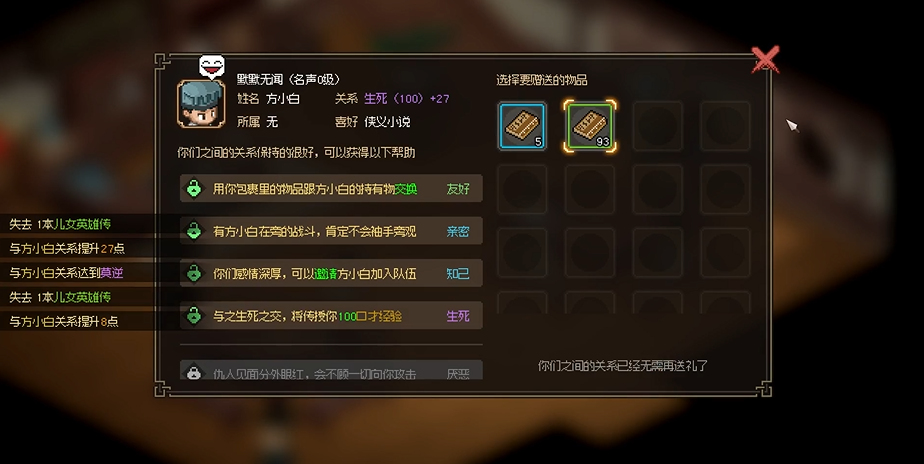 1、赠送儿女英雄传,增加27点好感,直至关系到达【知己】。