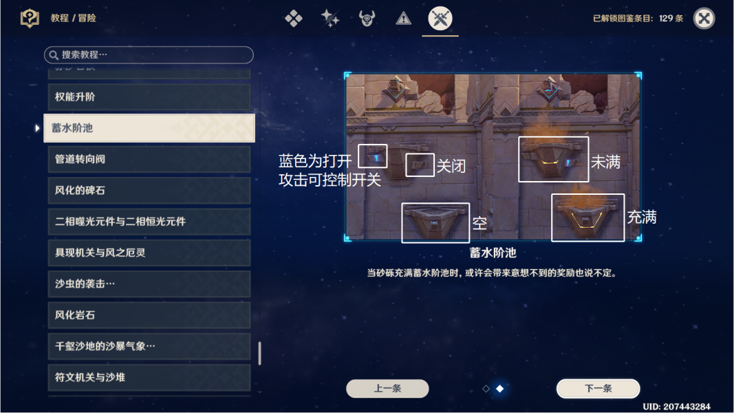 2、蓄水喷口:蓝色-打开,角色攻击可控制开关。蓄水阶池:有空、未满、充满这3种情况。