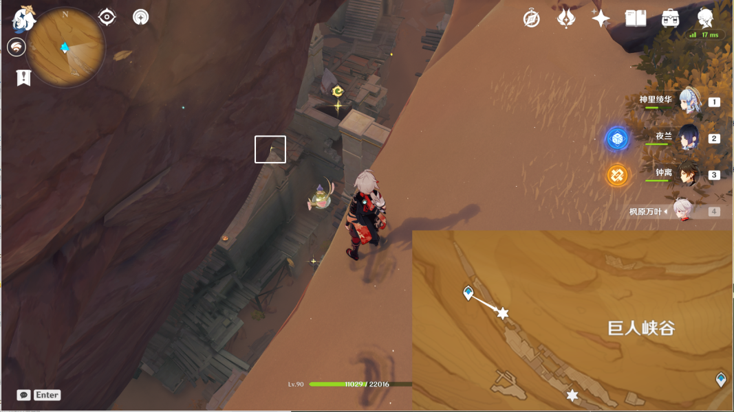 5、传送巨人峡谷图中锚点,往地图的西方向走,前往图中指引石柱位置。