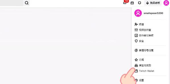 1、首先要登录“Twitch”,点击个人头像在下拉弹窗中找到掉宝与奖励。