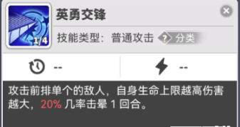 1、普通攻击叫做英勇冲锋,我们会攻击敌方前排,如果生命值越高伤害越高,有百分之二十几率打晕对面一回合。