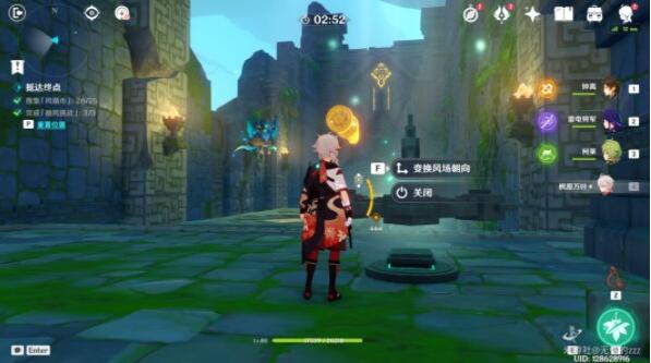 1、进入秘境之后,先关闭图中右边的机关,将风场关闭,然后将左边的拦风枢的风场方向调整为向上,弄好后,往左走。