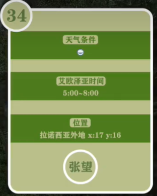需要我们在阴云天气时5:00-8:00来到拉诺西亚外地x:17,y:16的位置。