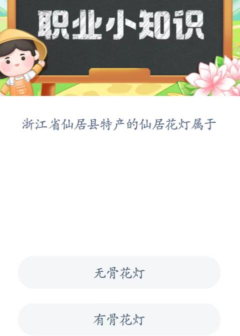 蚂蚁新村小课堂6月9日的职业知识小问题是:浙江省仙居县特产的仙居花灯属于?有的小伙伴们可能还不知道问题的答案是什么,那么接下来小编就整理了相关的内容给大家,一起来看看究竟是什么吧。