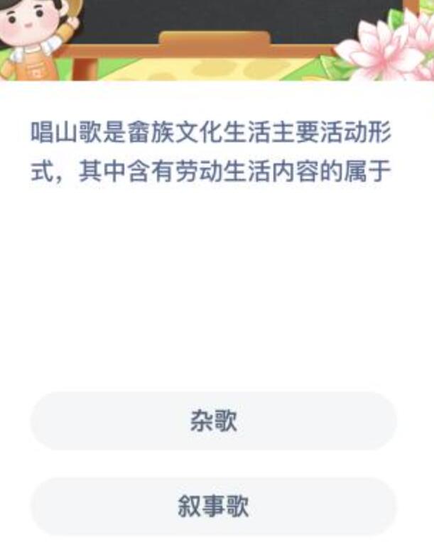 以上便是小编为大家带来的蚂蚁新村小课堂5月16日答案最新,大家可以了解到唱山歌其中含有劳动生活内容。