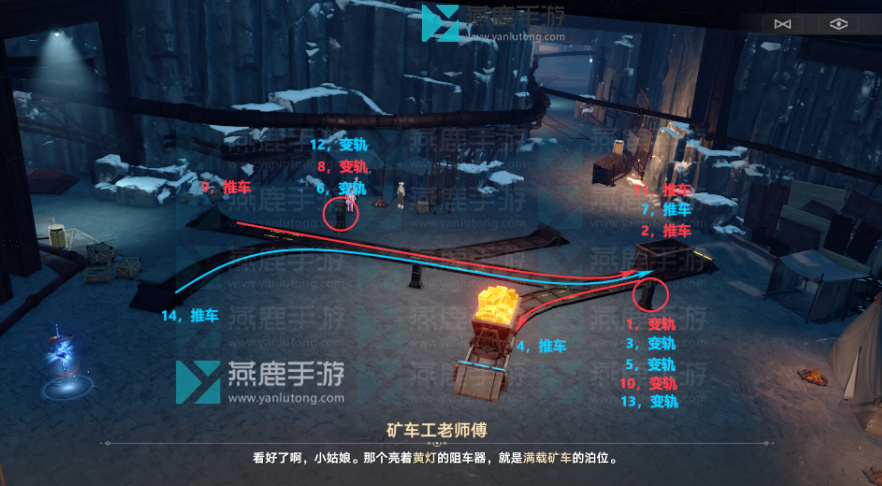 右侧再变轨,推满载矿车到1位置。左侧变轨后,推满载矿车即可,到达黄灯泊位。完成。