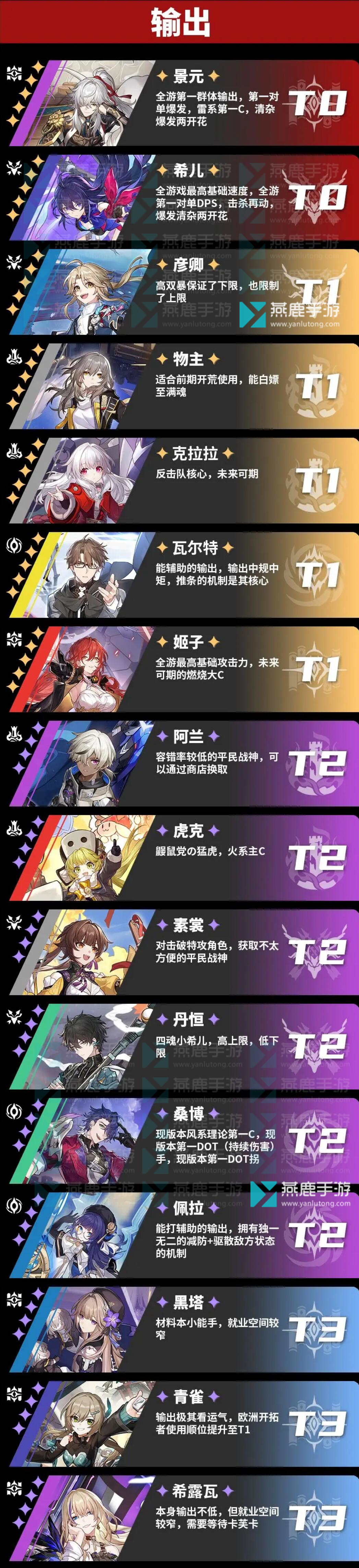 | T0 | 景元 | 全游第一群体输出,第一对单爆发,雷系第一c | |