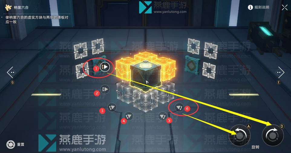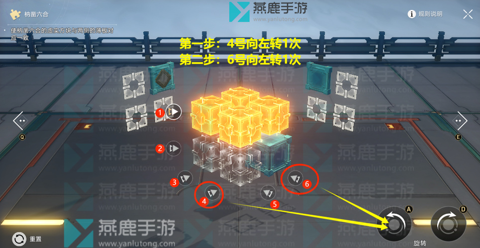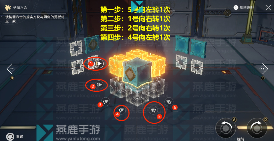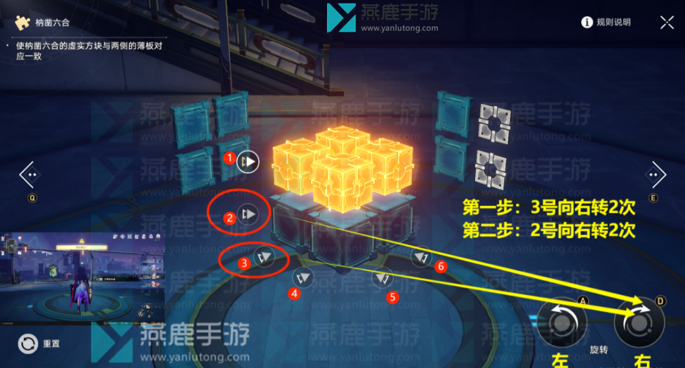 1、选择最右侧的按钮,向右旋转1次。选择左侧第三个按钮,向左旋转1次。
