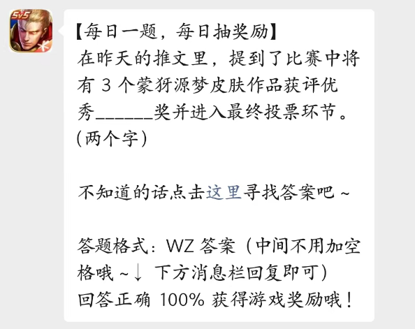 2023年的王者荣耀3月22日「每日一题,每日抽奖励」的问题是:在昨天的推文里,提到了比赛中将有 3 个蒙狩源梦皮肤作品获评优秀什么奖并进入最终投票环节?相信很多小伙伴都不知道问题的答案,接下来小编就给大家带来了3月22日王者荣耀每日一题的答案。