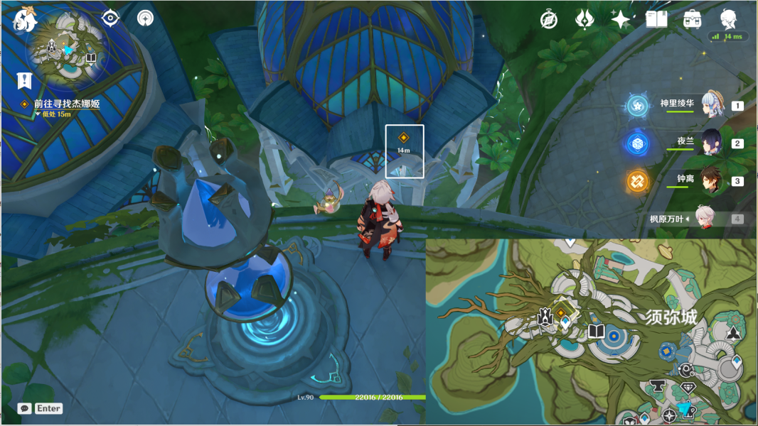 3、传送须弥城锚点,往下看,前往图中亭子寻找杰娜姬。