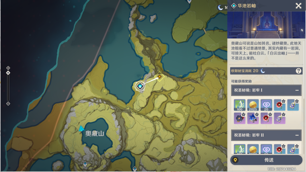 6、传送秘境[华池岩岫],往地图的东北方,前往山顶。