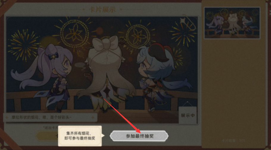 活动介绍:可以在活动中通过收集和交换烟花卡片,拥有一定种类的烟花卡片后,解锁抽奖功能。参与抽奖,赢取实物或游戏内奖励。