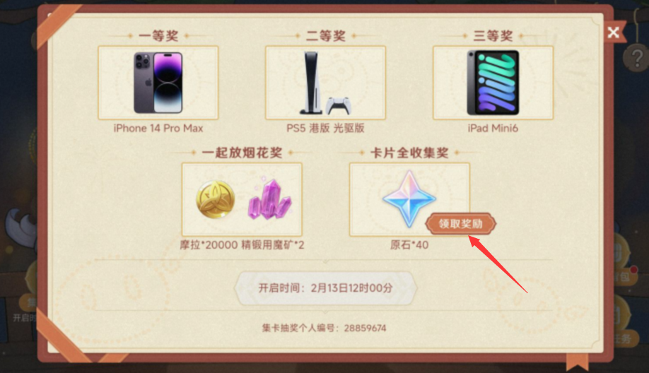 8、集齐后,点击左下角的[集卡抽奖],进入下图界面,点击领取奖励,等待开奖即可。