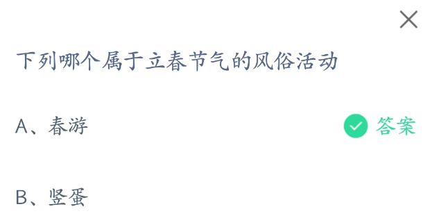 2023年2月4日蚂蚁庄园的问题分别是:好雨知时节”下一句是什么?下列哪个属于立春节气的风俗活动?那么有些小伙伴可能会有一些疑问,那么接下来就带大家来看看这两个问题的答案是什么吧,相信一定能够帮到大家的。