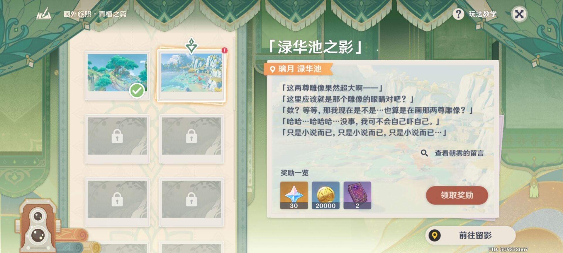 以上就是这篇文章有关原神画外旅照青植之篇攻略的所有内容了,这样就能够更好的完成活动任务了。更多游戏相关资讯内容,敬请关注本站。