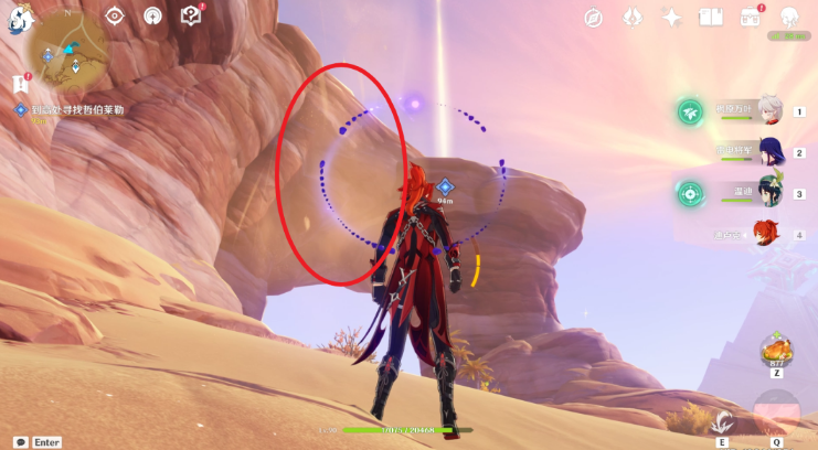 3、根据任务指引去寻找考古队的踪迹。一致走到陷坑处,触发派蒙对话。