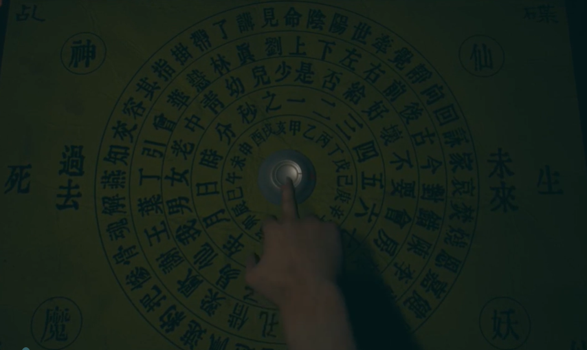 视频结束后,男主再次被传送到视频中的地方,桌子上有个法器,可以与其进行互动。有点类似与笔仙的玩法,互动结束后赶紧躲进柜子里,红衣女鬼马上出现。