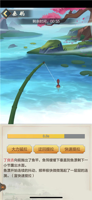进入鱼塘以后玩家可以看到一共有三种钓鱼方法,分别是大力往上提,迂回提上来和快速收竿,玩家要选择正确的收竿钓鱼方法才能保证钓上来灵鱼,而玩家每次钓鱼系统都会给玩家提示,玩家看下方对话框中,一有鱼咬钩就会弹出一段文字,只需要看最后括号里面的文字,里面有建议玩家选取的选项,玩家就按照系统推荐的选项点击就可以了。