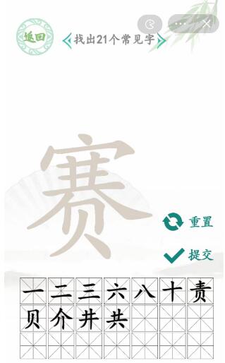 1、任务内容:根据题目所出的字“赛”中找出21个常见字(赛、责、穴、共、贝、一、二、三、六、十、土、八、井、介、王、干、工、人、厂、广、主)。