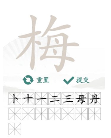 1、任务内容:根据题目提供的字“梅”中找出15个常见字(梅、木、每、母、一、二、三、十、悔、八、卜、寸、村、丹、舟)。