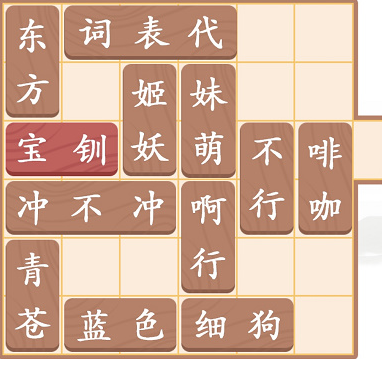 1、第一步把东方二字往上动一格,再把宝钗二字往左移一格,妖姬二字往下移一格,代表词三字往左移动两格,萌妹和代表词就可以被消除了。