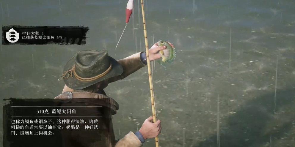 4、之后我们在此处再钓两条蓝鳃太阳鱼,即可完成生存大师挑战1.