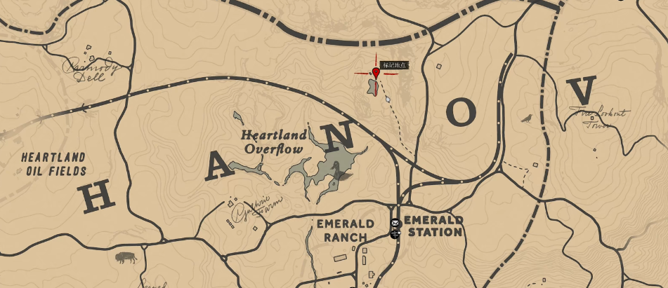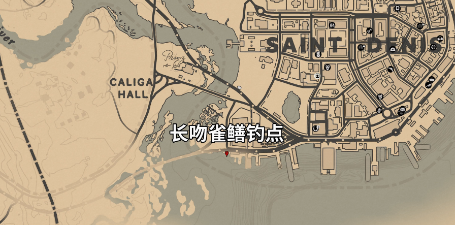 5、我们先来到圣丹尼斯西侧的铁路桥上钓褐首鲇,具体位置为如图标点位置所示,到达后站在下图所示的位置,使用玉米鱼饵即可钓到褐首鲇。