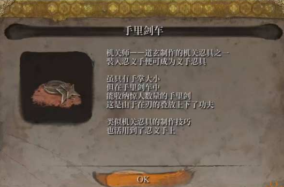 2、作用:在忍义手中装入了手里剑车的义手忍具,消耗纸人便可以使用,快速掷出的利刃,可削减敌人的HP与躯干,针对四处跳跃的敌人可给予其大伤害。