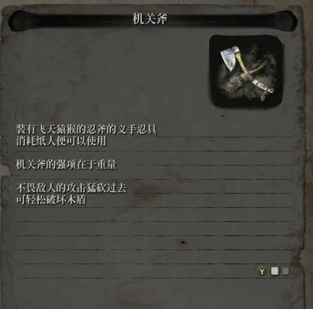 2、作用:装有飞天猿猴的忍斧的义手忍具,消耗纸人便可以使用,机关斧的强项在于重量,不畏敌人的攻击猛砍过去可轻松破坏木盾。