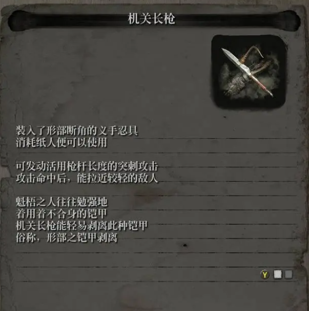 2、作用:装入了刑部断角的义手忍具,消耗纸人便可以使用,可反动活动枪杆长度的突刺攻击,攻击命中后能拉近较轻的敌人。