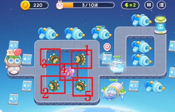 3、后期众多兔子源源不断来袭,但是我们不要害怕,升级船锚,第五波的时候可以建立多重箭增加输出,具体塔防位置如下。