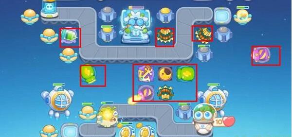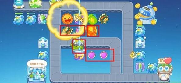 2、第二波的时候左边放飞机,清理道具获得金币之后,在中间位置放置星星和船锚。