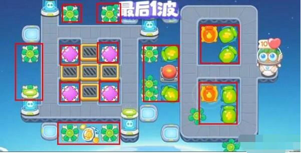 4、最后我们在第37关中只需要按如图所示的红框位置放置对应的防御塔且升满级即可轻松通关。