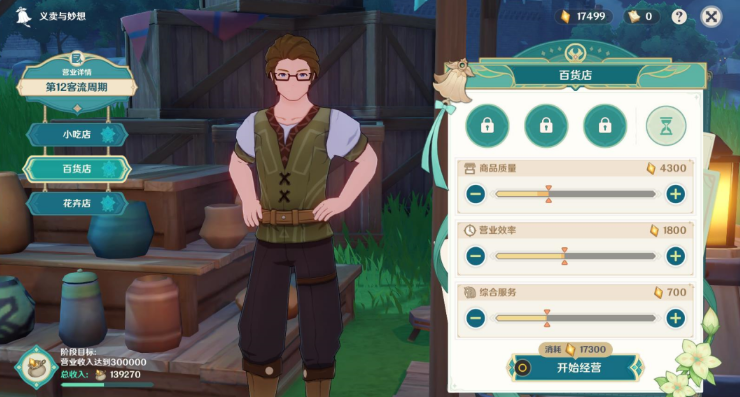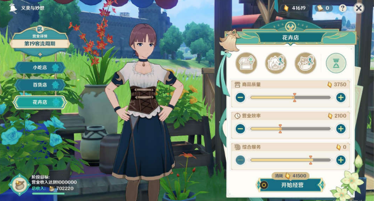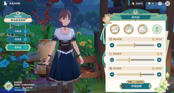 14、花卉店:商品质量分配280;营业效率分配0;综合服务分配1800。