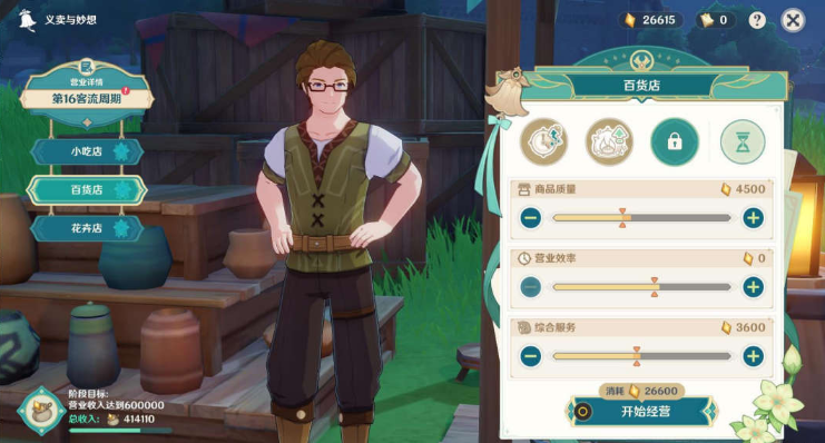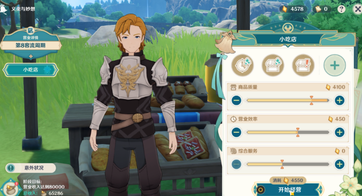 6、小吃店:商品质量分配0;营业效率分配3600;综合服务分配450。
