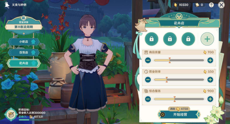 11、花卉店:商品质量分配0;营业效率分配1100;综合服务分配4500。