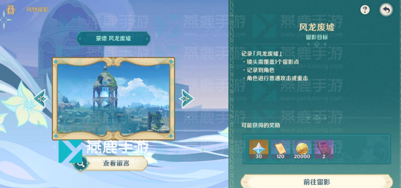 3、[风龙废墟]。需覆盖1个留影点 + 记录到角色 + 角色进行普通攻击或重击。
